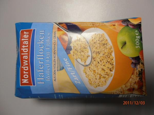 Oznámení přijaté systémem rychlého varování pro potraviny a krmiva (RASFF) se týká výrobku Nordwaldtaler Haferflocken - jemné ovesné celozrnné vločky, hmotnost balení 500 g, DMT 14.2.2013, 21.01.2013, 06.01.2013, 11.01.2013 a 17.01.2013. Výrobcem je Peter Kölln KGaA, Westerstr. 22 - 24, 25336 Elmshorn, Německo. Stanovený limit pro deoxynivalenol byl ve vločkách překročen až trojnásobně.