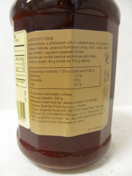 Ve vzorku Danish Choice JAHODOVÝ DŽEM, (340 g, DMT 20.06.2013) bylo rozborem zjištěn pouze 22,4% podílu jahod, přestože obal sliboval zákazníkům 40%.