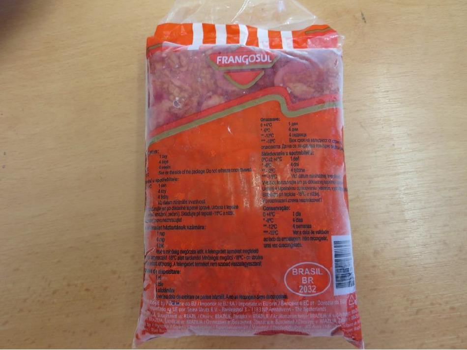 Játra byla označena datem minimální trvanlivosti do 17. 9. 2017, šarží MN 079 216, a jako výrobce byla uvedena brazilská společnost JBS Aves Ltda-Matadouro de Avese Coelhos-Rua Buarque de Macedo, 3620, Montenegro, země původu: Brazílie.