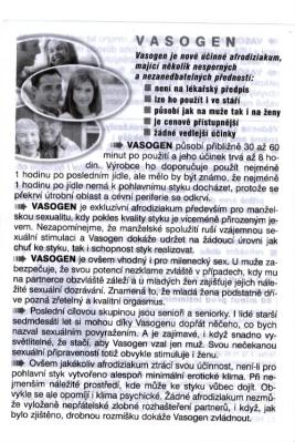 VASOGEN vyráběný americkou společností Ultra Health Products Inc. je do České republiky dovážen firmou P.A.A. Agency s.r.o. a na trh je uváděn jako doplněk stravy pro podporu sexuálních funkcí.