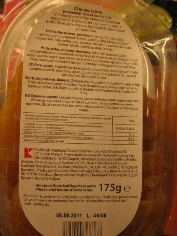 Státní zemědělská a potravinářská inspekce nařídila stáhnout z oběhu výrobek STILLA natura Hrušky sušené, proslazené (šarže L:46/08, DMT 8. 6. 2011, hmotnost výrobku 175 g) původem z Číny. Laboratorní rozbory prokázaly, že tento výrobek obsahuje nadlimitní množství oxidu siřičitého.