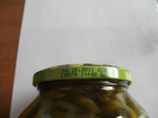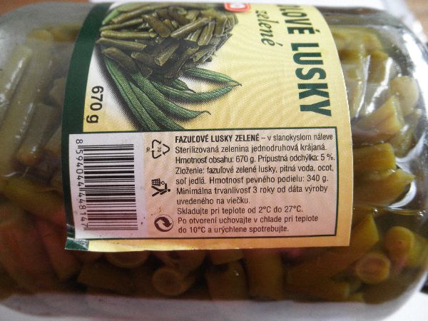 1.Fazolové lusky zelené, balené ve skle, hmotnost 670 g, údajný výrobce PT servis konzervárna spol. s r. o., Tábor, Purkyňova 1000, ČR, šarže L8274. Datum vyražené na víčku je 2.10.2011, papírová etiketa uvádí, že minimální trvanlivost výrobku činí 3 roky od data na víčku.