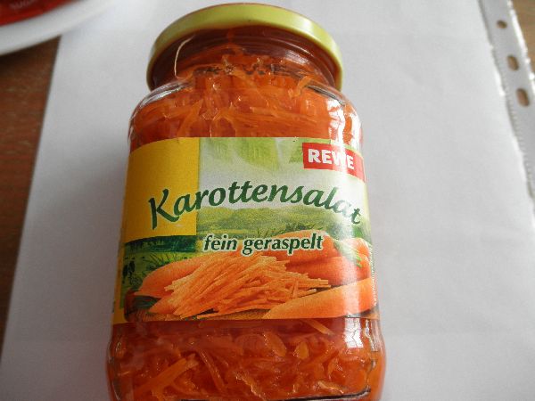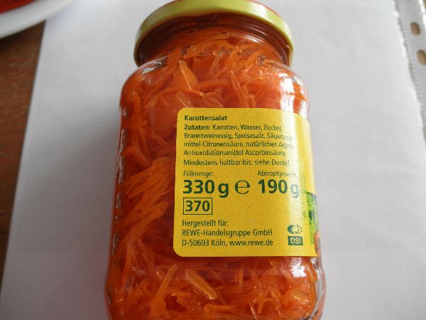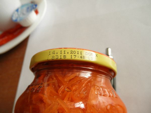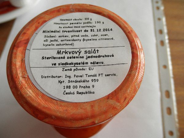 2. Mrkvový salát ve sladkokyselém nálevu, balený ve skle, hmotnost 330 g, země původu EU, distributor: Ing. Pavel Tomáš, PT servis, Kpt. Stránského 959, Praha 9, ČR,šarže L 8318. Na víčku byly nalepeny přes sebe dvě kruhové etikety s rozdílným textem. Vrchní etiketa uvádí DMT do 31.12.2014. Na boční straně víčka je dále vytištěno datum: 14.11.2011.