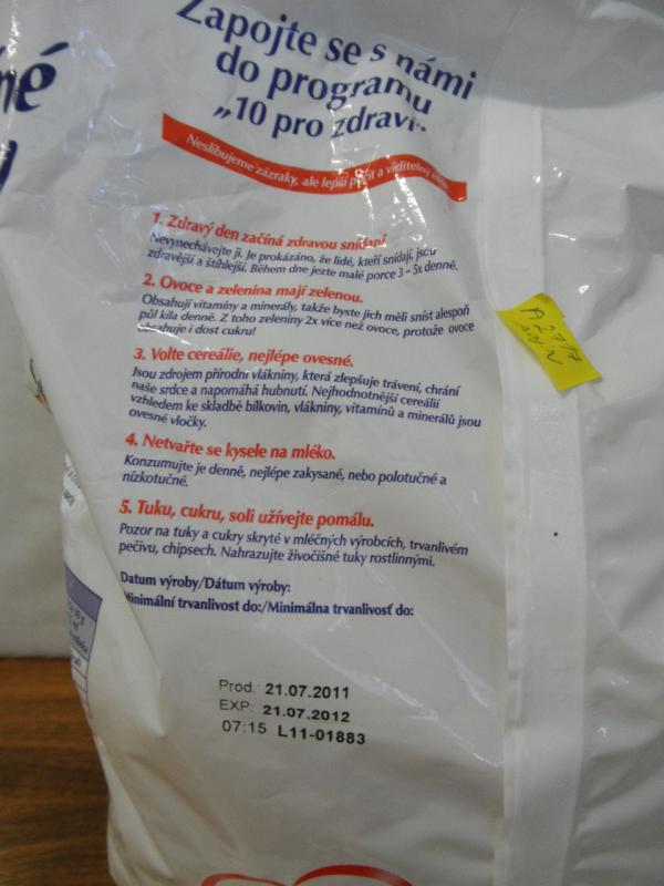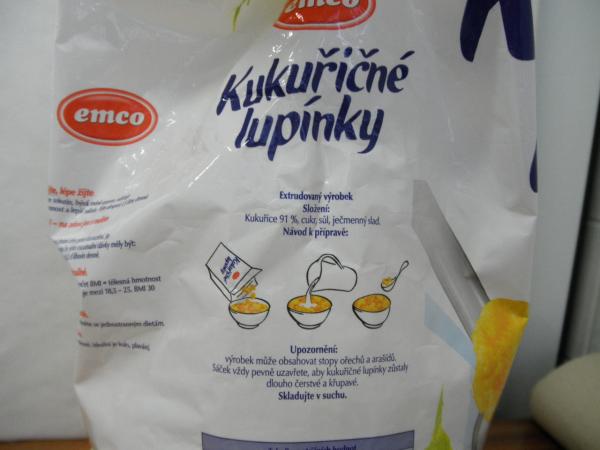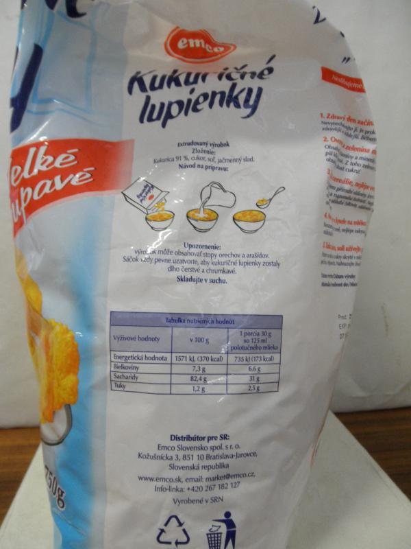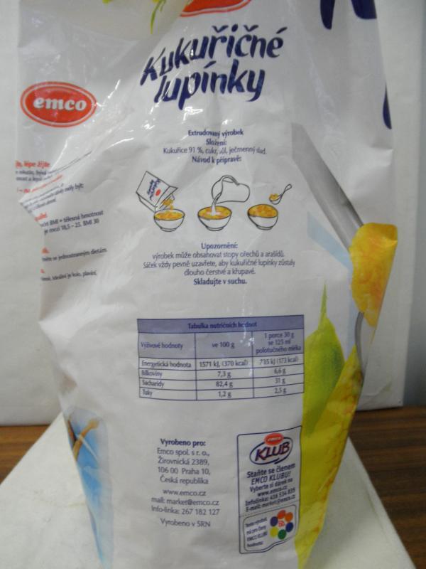 Jde o výrobek s názvem „Kukuřičné lupínky Velké křupavé“, hmotnost balení 750g, šarže L11-01883, minimální trvanlivost do 21.07.2012, vyrobeno v SRN pro Emco spol. s r.o.