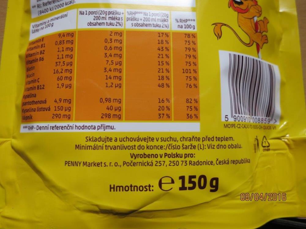 PENNY CHO Quick, Instantní kakaový nápoj 10 vitamínů+vápník v balení 150 g a s označením data minimální trvanlivosti do 04/2017, vyrobeno v Polsku pro: PENNY Market s.r.o. Výrobce na obalu ve složení mj. uvedl: vitamín B2 – 1,1 miligramů (mg) na 100 g. Laboratorní rozbor SZPI ale potvrdil přítomnost vitamínu B2 pouze v hodnotě 0,53 mg na 100 g a informace na výrobku tak uváděla spotřebitele v omyl. Dále laboratorní analýza v předmětné šarži potraviny zjistila přítomnost alergenu mléčná bílkovina v koncentraci 2 764 mg/kg, přičemž výrobce na obalu deklaroval pouze stopy mléka.
