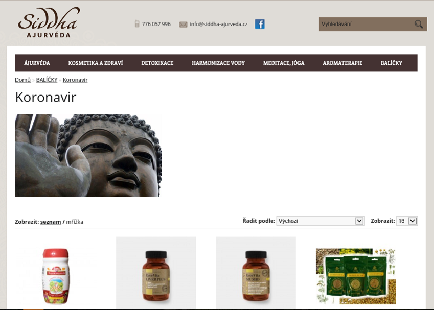 3. Nabídka doplňků stravy na stránce  www.siddha-ajurveda.cz, kontrolovaná osoba na e-shopu  zřídila záložku „BALÍČKY“ s podzáložkou „Koronavir“, kde spotřebitelé mohli nakupovat mj. doplňky stravy. Samotný název prodejní podzáložky je považován za zakázané léčebné tvrzení. Kontrolovanou osobou je subjekt Ing. Sadajyoti, Zlín.