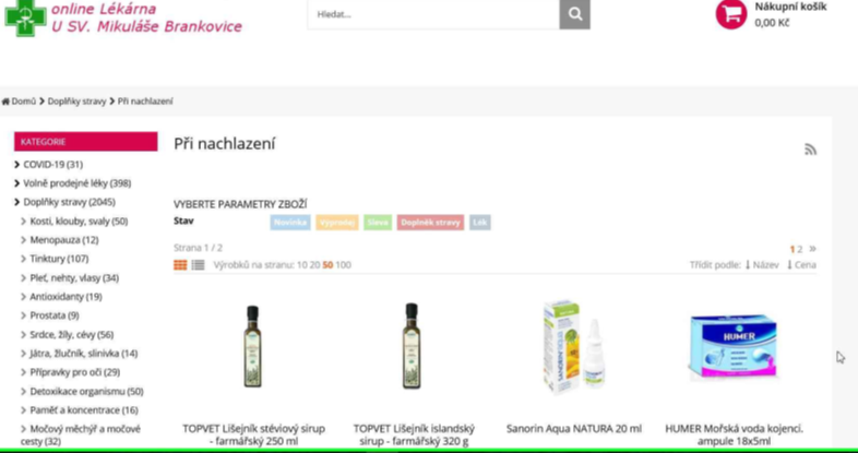 - Nabídka doplňků stravy na stránce www.lekarna-brankovice.cz, kontrolovaná osoba na e-shopu zřídila prodejní kategorii „COVID-19“, kde spotřebitelé mohli nakupovat mj. doplňky stravy. Samotný název prodejní podzáložky je považován za zakázané léčebné tvrzení. Dále kontrolovaná osoba uváděla nepovolená léčebná tvrzení: „Lišejník islandský obsahuje celou řadu aktivních látek, které mají až „antibiotický“ účinek (lichenin, isolichelin, jód). Lišejník je doporučován při zánětech horních cest dýchacích a k podpoře vykašlávání. Lišejník je tradičně používán při průjmech, žaludečních a střevních katarech.“ Kontrolovanou osobou je subjekt Miroslava Odrazilová, Brankovice.