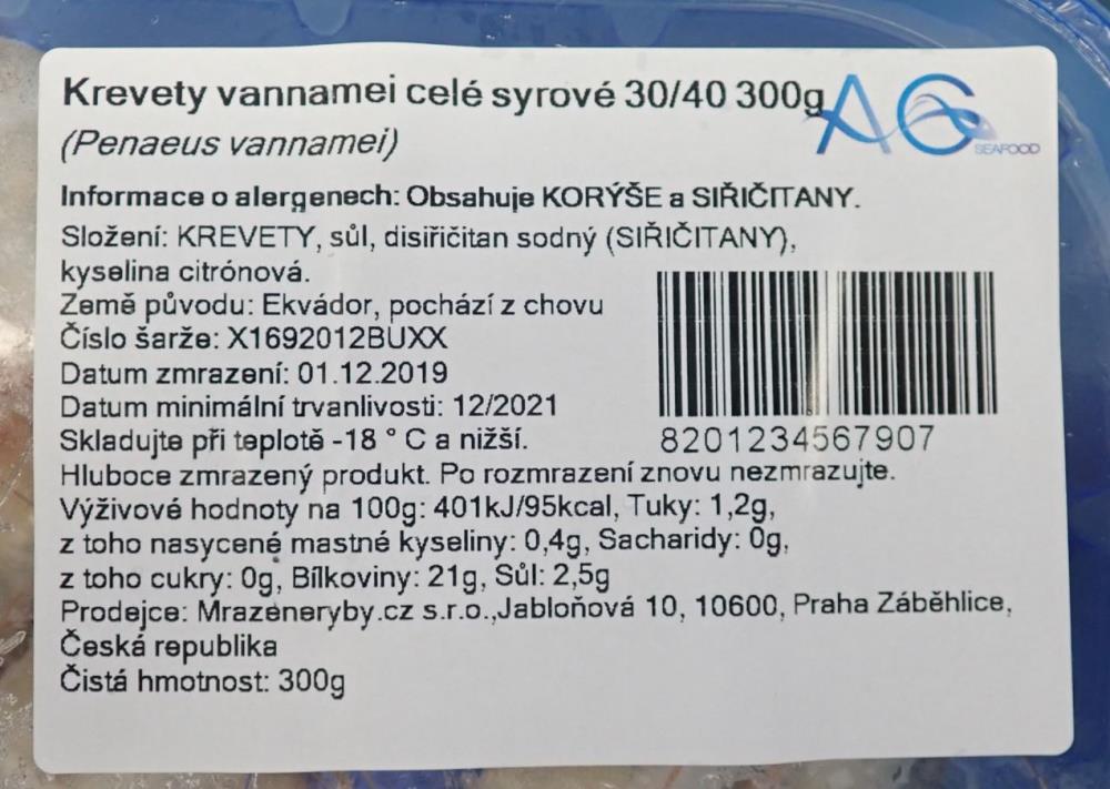 Státní zemědělská a potravinářská inspekce (SZPI) varuje spotřebitele před konzumací potraviny Krevety vannamei celé syrové 30/40, hluboce zmrazený produkt, v balení 300 g, číslo šarže: X1692012BUXX, datum minimální trvanlivosti: 12/2021, země původu: Ekvádor, Prodejce: mrazeneryby.cz s.r.o., Jabloňová 10, 10600, Praha Záběhlice, ČR.
