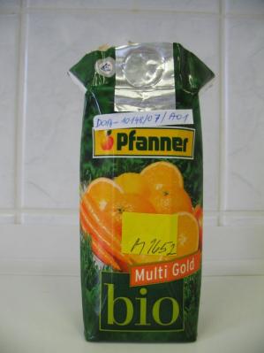 Jedná se o vícedruhový nápoj ze směsi ovocného a karotkového koncentrátu s názvem PF Bio Multi Gold, velikost balení 0,2 l od výrobce Hermann Pfanner Getränke Ges. m.b.H. z Rakouska. Výrobek nevyhověl senzorickým znakům a laboratoř SZPI v Praze ve výrobku prokázala výskyt plísní. Na výrobku bylo uvedeno datum minimální trvanlivosti 25.05.2008.