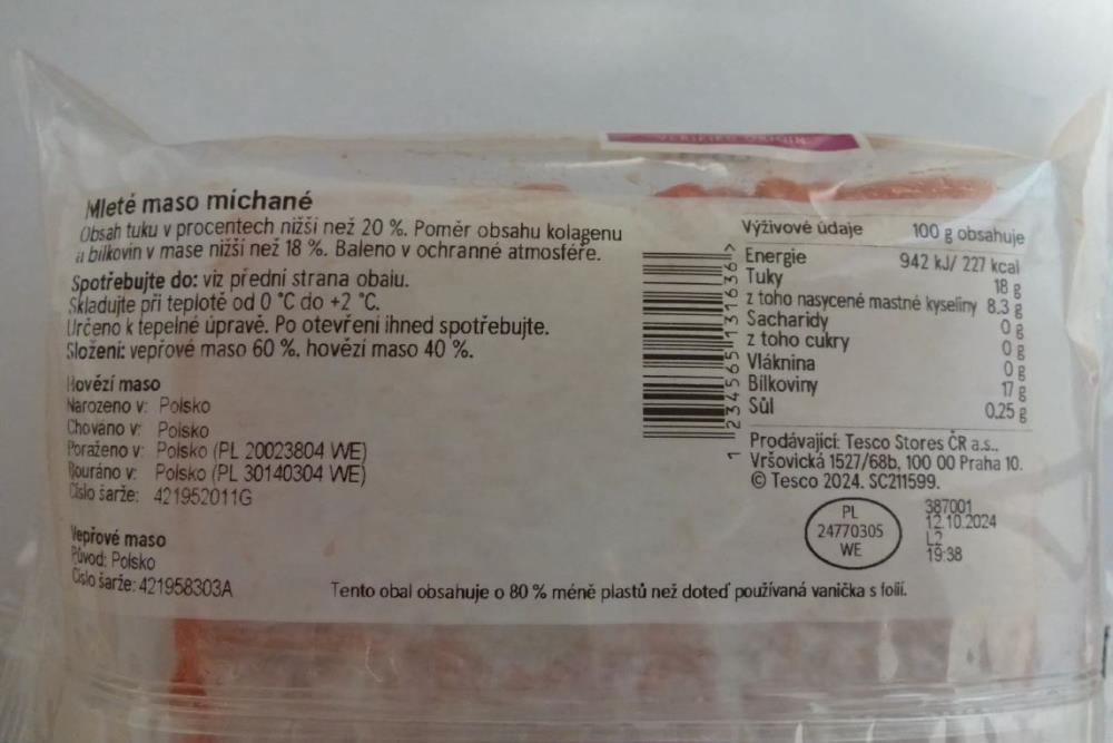 Státní zemědělská a potravinářská inspekce (SZPI) varuje spotřebitele před nevyhovující potravinou TESCO Mleté maso míchané, datum použitelnosti: 20.10.2024, chov a porážka: Polsko, veterinární identifikační označení: PL 24770305 WE. Inspektoři vzorek odebrali v provozovně Tesco Stores ČR a.s., Sokolovská 2164, 347 01 Tachov.