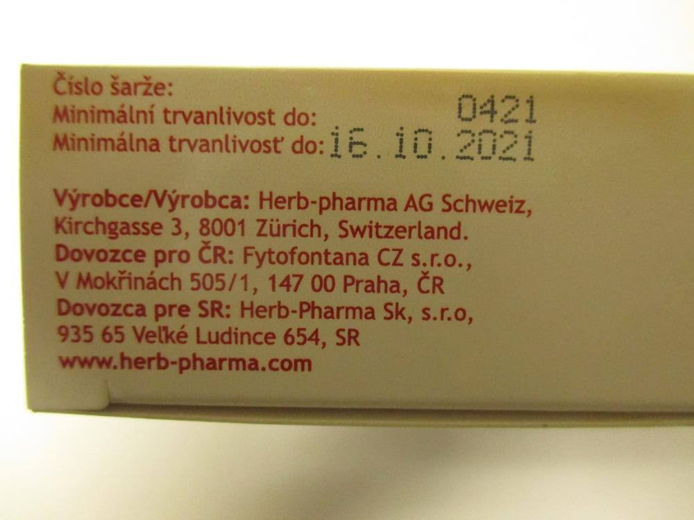 V rámci cílených kontrol jakosti a bezpečnosti doplňků stravy Stání zemědělská a potravinářská inspekce zakázala společnosti PHARMOS, a.s., Ostrava uvádět do oběhu nevyhovující doplněk „Fytofontana AURECON Ring stop“, označení šarže: 0421, datum minimální trvanlivosti: 16. 10. 2021, výrobce: Herb-pharma AG Schweiz, země původu: Švýcarsko.