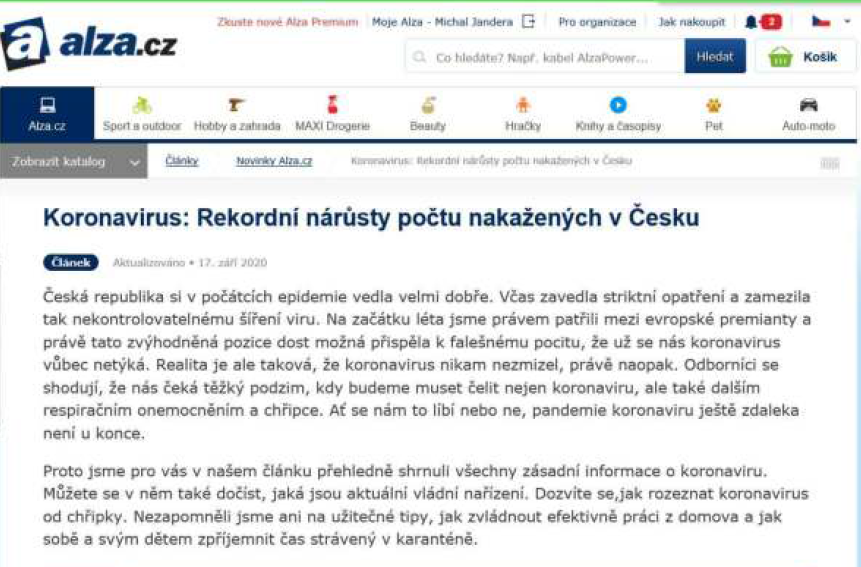 3. Reklama na doplňky stravy na stránce https://www.alza.cz/koronavirus, kontrolovaná osoba zde k doplňkům stravy uváděla nepovolená léčebná tvrzení: „Koronavirus“, „nakažených“, „Covid-19 i chřipka“, „nakažlivých respiračních onemocnění“, „viry“, „Koronavirus i chřipka mají velmi podobné symptomy“, „Vysoká horečka a zimnice, Suchý kašel, Dušnost, Únava, Bolest v krku, Bolest svalů a celého těla, Bolest hlavy, Rýma nebo ucpaný nos“, a „zvracení a průjem“. Kontrolovanou osobou je společnost: Alza.cz a.s.