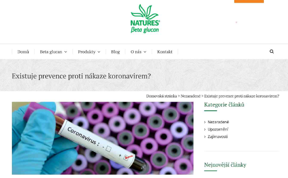 2. Reklama na doplňky stravy na stránce www.enatures.cz/existuje-prevence-proti-nakaze-koronavirem/, kontrolovaná osoba zde v rámci reklamy na doplněk stravy uváděla nepovolená léčebná tvrzení: „lék a vakcínu“, „koronavirus“, „koronavirem“, „onemocněním“, „viru“, „kašlání“, „kýchání“, „nákazy koronavirem“, „prevence“, „viry a bakteriálními útoky“, „onemocněním“, „akutním respiračním infekcím a chřipce“ a „proti virům, parazitům, plísním nebo bakteriím“. Provozovatelem je dle informace na webových stránkách společnost NATURES s.r.o., Trnava, Slovensko. SZPI informaci vložila do evropského systému pro komunikaci mezi evropskými dozorovými organizacemi - AACS - se žádostí o uložení opatření ze strany slovenského kontrolního orgánu