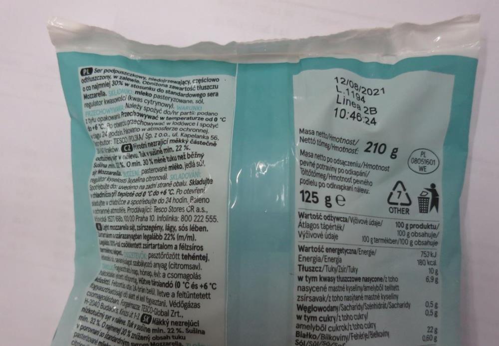 Státní zemědělská a potravinářská inspekce (SZPI) nařídila společnosti Tesco Stores ČR a.s., aby neprodleně stáhla ze všech svých poboček falšovanou potravinu TESCO LIGHT MOZZARELLA v balení 210 g, datum použitelnosti: 12/08/2021, označení šarže: L.1194, země původu: Polsko.
