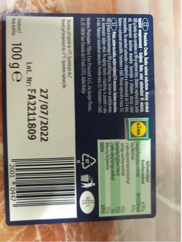 Potravinářská inspekce nařídila společnosti Lidl Česká republika v.o.s, aby neprodleně stáhla z celé své tržní sítě nevyhovující potravinu ITALIAMO Prosciutto Crudo s označením data minimální trvanlivosti do 27. 7. 2022, označení šarže: FA2211809, výrobce: Filiera Uno Prosciutti S.r.l., via Jacopo Pirona, 15, IT-33038 San Daniele del Friuli, Itálie, země původu: Itálie.