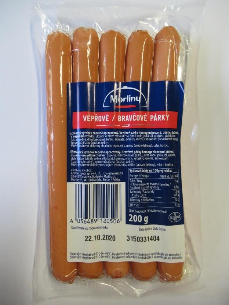 Státní zemědělská a potravinářská inspekce (SZPI) zjistila v tržní síti nevyhovující potravinu Morliny VEPŘOVÉ PÁRKY v balení 200g, s označením data použitelnosti do 22. 10. 2020, výrobce: Animex Foods sp. z o.o., ul. T. Chałubińskiego 8, 00-613 Warszawa, Oddział w Morlinach, Morliny 15, 14-100 Ostróda, Polsko.