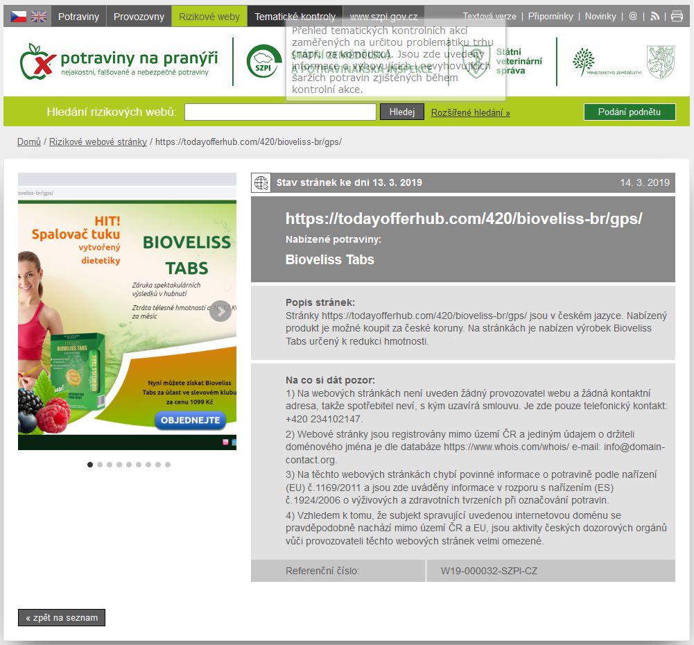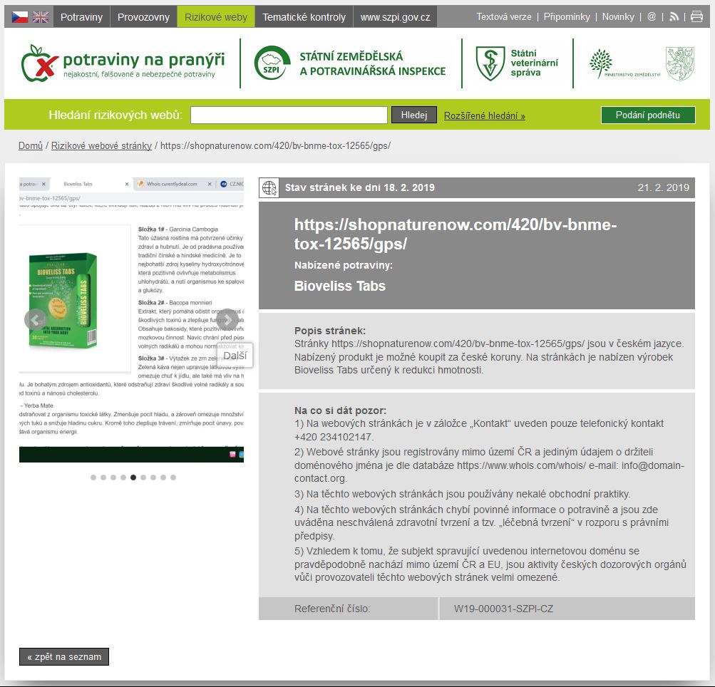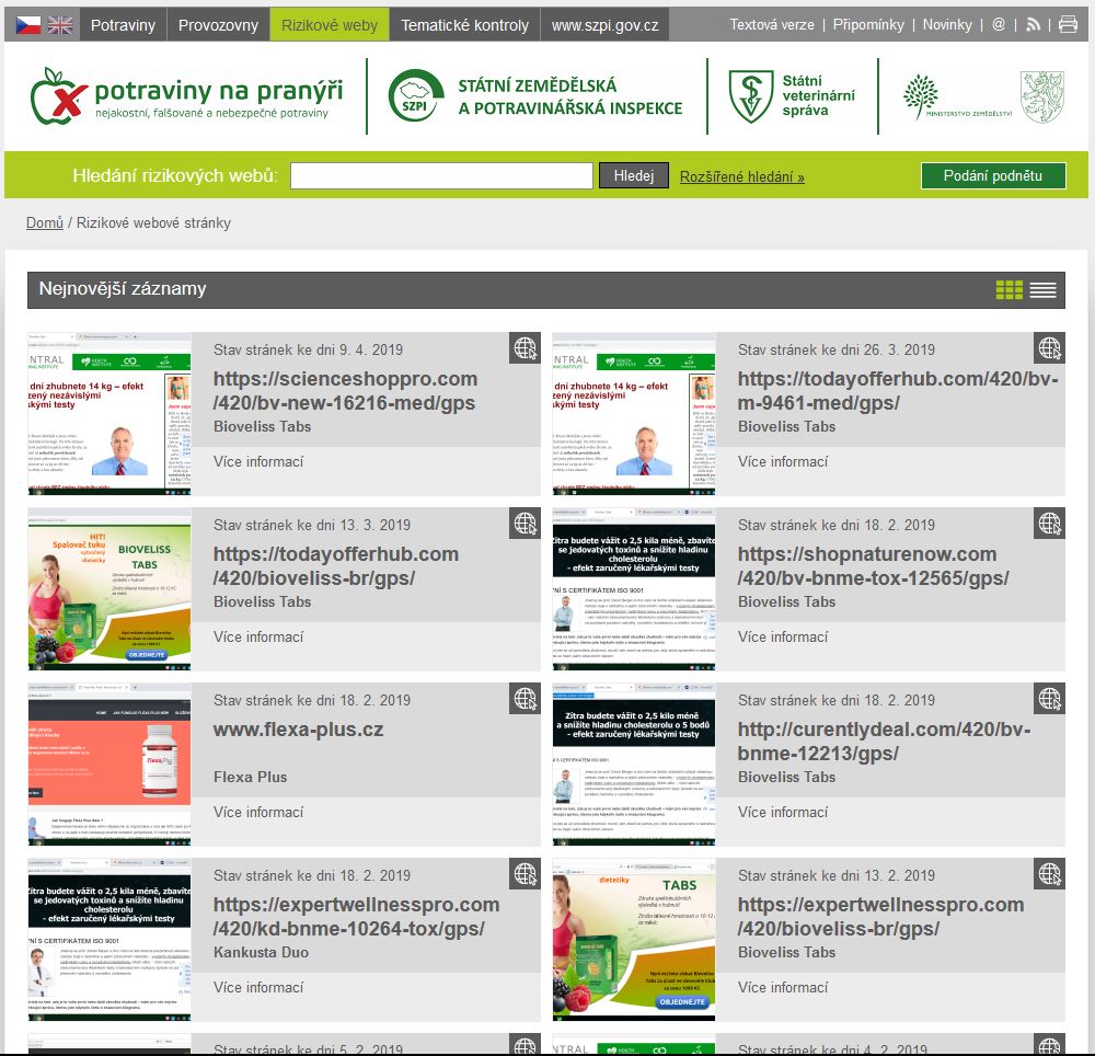 Státní zemědělská a potravinářská inspekce (SZPI) aktuálně spustila na webu Potraviny na pranýři (www.potravinynapranyri.cz) novou sekci Rizikové weby. Tato služba informuje spotřebitele o webových stránkách, u kterých SZPI zjistila, že nabízejí potraviny - zejména doplňky stravy – v rozporu s právními předpisy ČR a EU. Jedná se o stránky, které jsou jednoznačně orientovány na tuzemského spotřebitele – zboží prezentují v českém jazyce, prodej nabízí v českých korunách a umožňují doručení zásilky do ČR –, ve skutečnosti ale jejich provozovatelé sídlí převážně mimo území EU, případně jejich sídlo nelze identifikovat a SZPI tak u těchto prodejců má velmi omezenou možnost vymáhat dodržování právních předpisů.