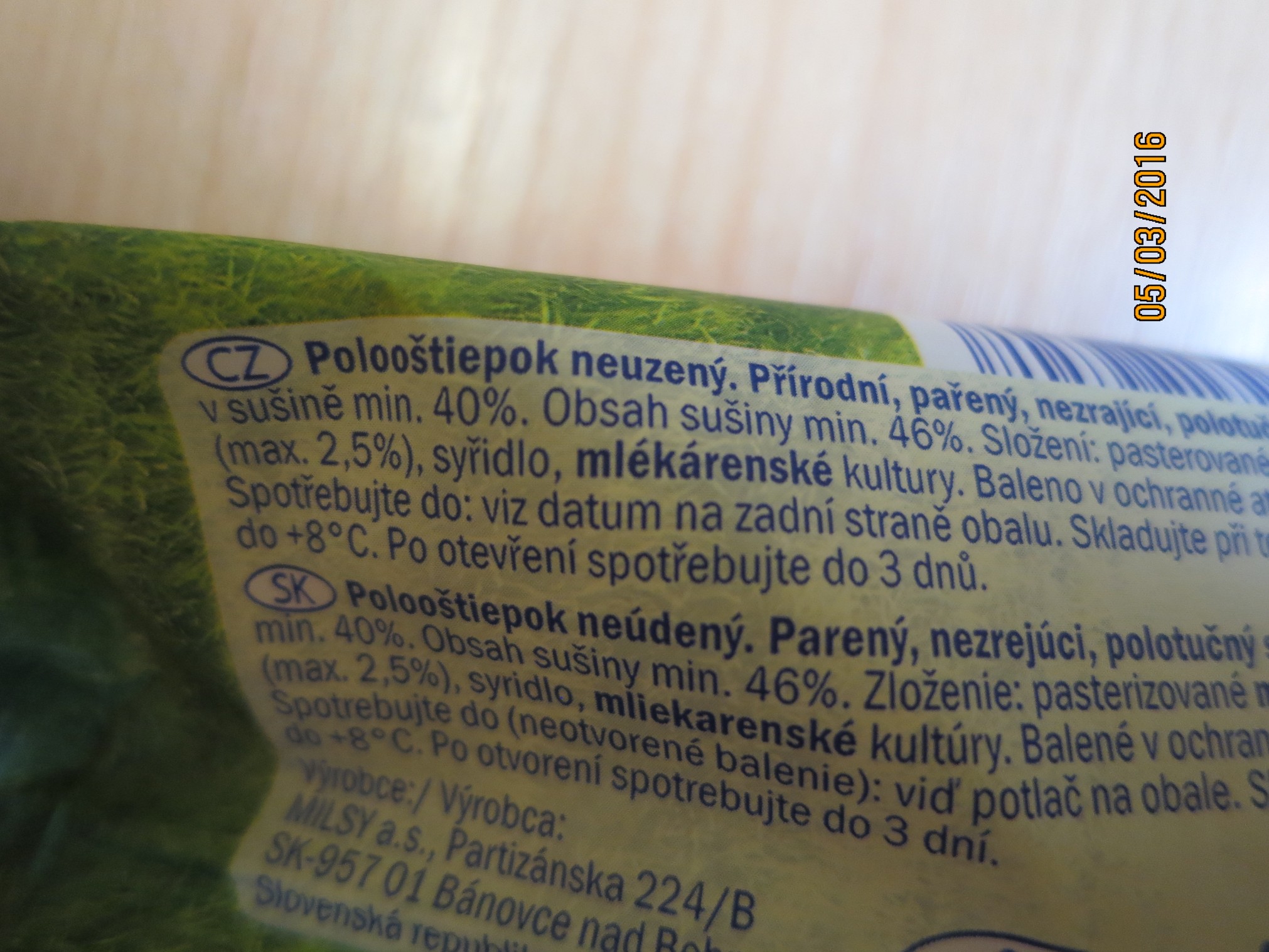 Státní zemědělská a potravinářská inspekce (SZPI) zjistila při kontrole pobočky společnosti Lidl Česká republika v.o.s, závadný sýr Bluedino Polooštiepok neuzený v balení 190 gramů a s označením šarže L 16 087 – 11, výrobce: MILSY a.s., Partizánská 224/B SK-957 01 Bánovce nad Bebravou, Slovensko.