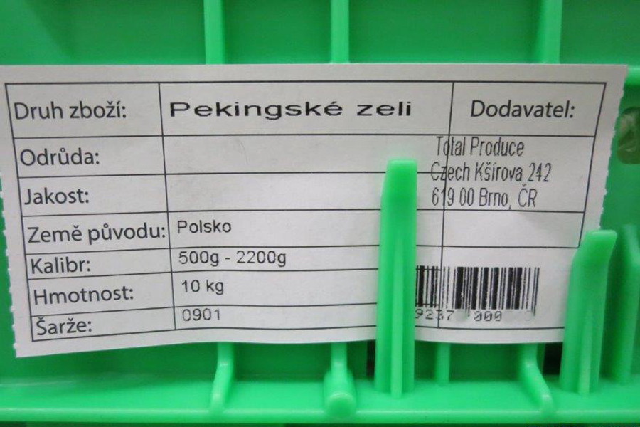 Zelí pekingské, označené šarže: 0901, země původu: Polsko. Laboratorní rozbor v potravině potvrdil nadlimitní přítomnost herbicidu fluazifop-P, a to v hodnotě 0,11 mg/kg (miligramů na kilogram, limit: 0,01 mg/kg). Místo odběru vzorku: Penny Market s.r.o., Dobřany, Osoblaho 1275, 33441; dodavatel: TOTAL PRODUCE CZECH S.R.O., Brno.