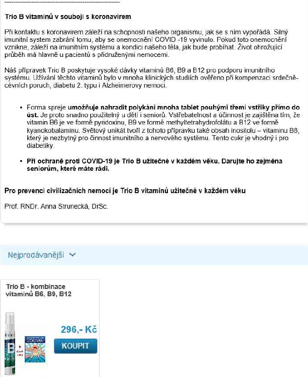 - Internetový prodej na stránce centralnilekarna.cz, kde kontrolovaná osoba nabízela doplněk stravy pod názvem „Trio B vitamínů v souboji s koronavirem“, a to za použití zakázaných léčebných tvrzení, mj. „Při ochraně proti COVID-19 je Trio B užitečné v každém věku. Darujte ho zejména seniorům, které máte rádi.“. Kontrolovanou osobou je společnost: LÉKÁRNA NA NÁMĚSTÍ BEROUN s.r.o.