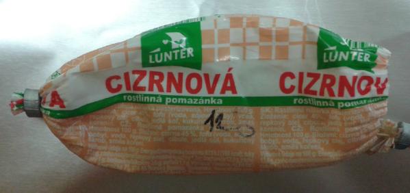 Cizrnová rostlinná pomazánka, značka Lunter, balení 100 g, doba minimální trvanlivosti do 21/08/2015.