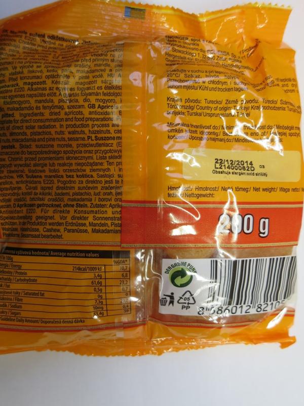 - Meruňky sušené vypeckované á 200 g, označené šarží: L21400062D, DMT: 22/12/2014, od výrobce: ENCINGER, spol. s r.o., Bratislava, země původu: Turecko. Ve 32 balení z 38 kontrolovaných byla zjištěna přítomnost živých či mrtvých škůdců. Ve všech kusech hodnocených kontaminovaných balení byl zjištěn nepříjemný zápach po kvašení.