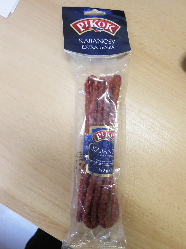 PIKOK KABANOSY EXTRA TENKÉ, velikost balení: 120 g, šarže: L 0212/F130/14457 07:34:59/ 11 13, datum minimální trvanlivosti do: 20.06.2019, země původu: Polsko. Výrobce na obalu mj. uvedl: „100g kabanosů bylo vyrobeno ze 143g vepřového masa a 14g hovězího masa“. Laboratorní rozbor ale neprokázal přítomnost hovězí bílkoviny, výrobek tak namísto deklarovaných 14 gramů hovězího masa obsahuje maximálně 1 gram hovězího masa (limit laboratorní metody).