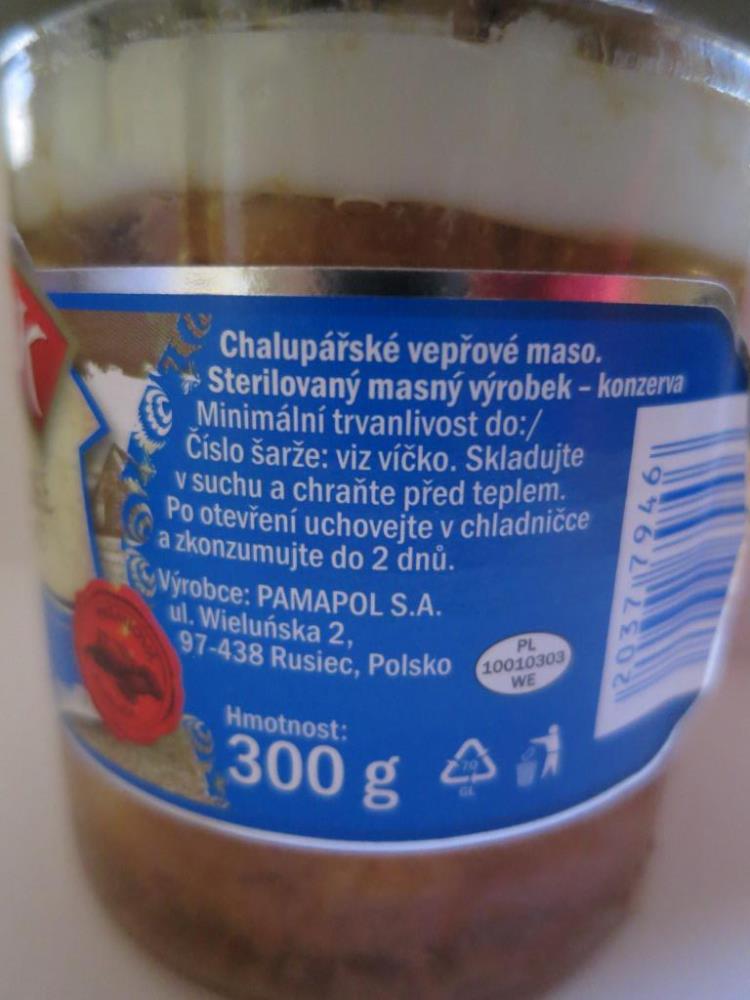 Pikok Chalupářské vepřové maso, Sterilovaný masný výrobek - konzerva, hmotnost 300 g, číslo šarže: L 1576, DMT: 07.02.2020. Na etiketě potraviny byla uvedena informace 89 % masa, laboratorním rozborem byl zjištěn obsah masa 67,5 %.
