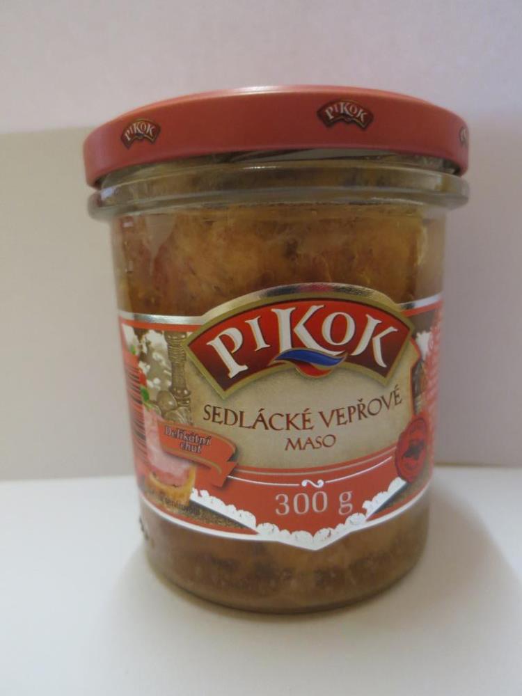 Pikok Sedlácké vepřové maso, Sterilovaný masný výrobek s přídavkem mléčné bílkoviny - konzerva, hmotnost 300 g, číslo šarže: L 3301, DMT: 27.11.2019. Na etiketě potraviny byla uvedena informace 76,7% vepřové maso, 10% vepřová kýta, laboratorním rozborem byl zjištěn obsah masa 70 %.