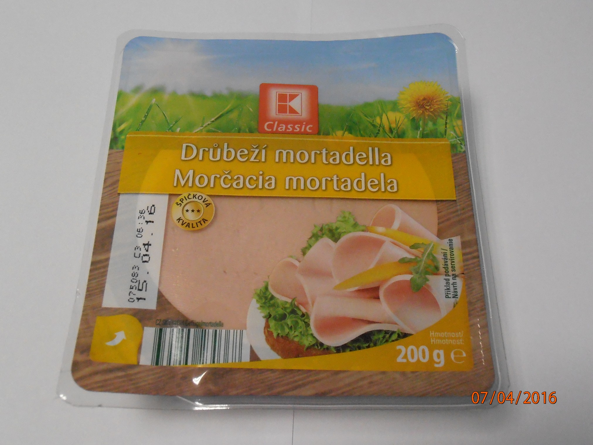 Inspektoři Státní zemědělské a potravinářská inspekce (SZPI) odebrali v rámci běžných kontrol v provozovně společnosti Kaufland Česká republika v.o.s. potravinu Drůbeží mortadella, masný výrobek tepelně opracovaný, označení šarže 075083, Prodávající: Kaufland Česká republika v.o.s, země původu: Německo. Na obalu potraviny bylo ve složení mj. uvedeno, že obsah masa představuje 70% hmotnosti výrobku. Při širokospektrální analýze však vyšlo najevo, že obsah masa je ve výši 57%.