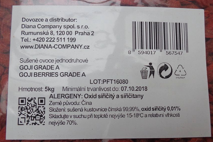 Jedná se o potravinu GOJI GRADE A – sušené ovoce jednodruhové, označené dobou minimální trvanlivosti do 7. 10. 2018, označení šarže: LOT: PFT16080, dodavatel: QINGDAO PERFECT IMPORT & EXPORT CO. LTD, ROOM 2201, UNIT 2, BUILDING 3, NO.7B SHANDONG ROAD, QINGDAO, Čína. Nevyhovující vzorek inspektoři odebrali s ohledem na sledování cizorodých látek, a to v provozovně společnosti Diana Company s. r. o., Rumunská 8, 120 00 Praha 2, která je i dovozcem potraviny do ČR.