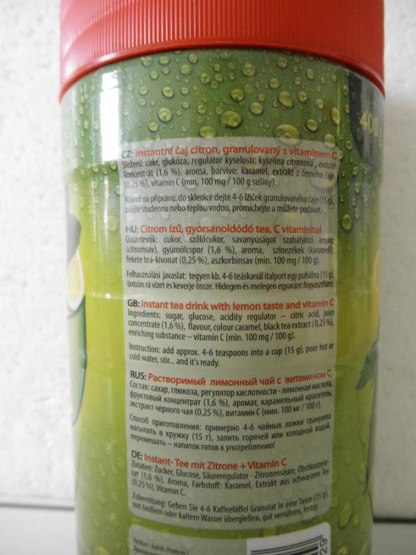 Instant tea CITRON v balení 400 g, s označením data minimální trvanlivosti do 5. 3. 2015, výrobce: LN GROUP s.r.o., šarže: L 3, země původu: Česká republika. Na obalu výrobce uvedl informaci pro spotřebitele extrakt z černého čaje (0,25%), laboratorní analýza SZPI ale potvrdila přítomnost extraktu z černého čaje maximálně v množství 0,02%.