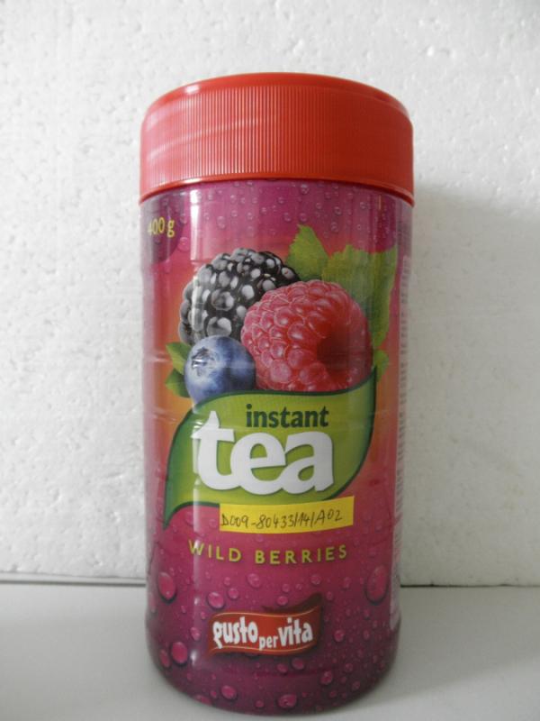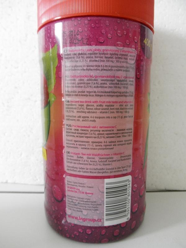 Instant tea LESNÍ PLODY (WILD BERRIES) v balení 400 g, s označením data minimální trvanlivosti do 23. 11. 2015, výrobce: LN GOUP s.r.o., šarže: L 2, země původu: Česká republika. Na obalu výrobce uvedl informaci pro spotřebitele extrakt z černého čaje (0,25%), laboratorní analýza SZPI ale potvrdila přítomnost extraktu z černého čaje maximálně v množství 0,02%.