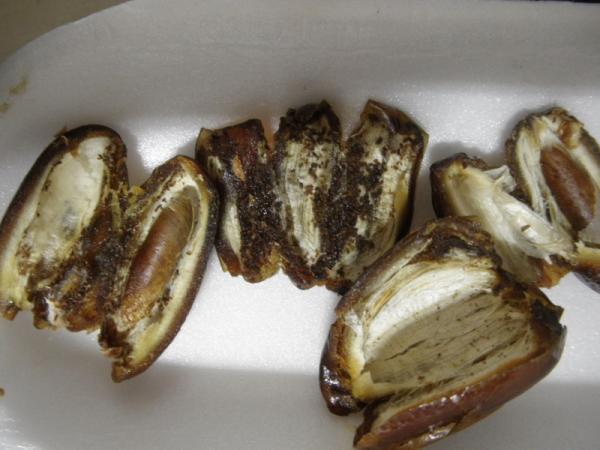 Plody vykazovaly poškození způsobené škůdci (požer a exkrementy). Poškození plodů bylo zjištěno u všech hodnocených balení (každé balení obsahovalo 2 - 7 znehodnocených plodů škůdci).