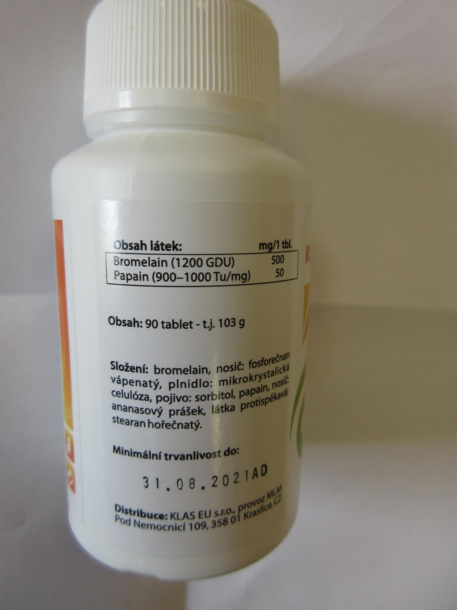 Státní zemědělská a potravinářská inspekce (SZPI) v rámci kontrol potravin nabízených na internetu zjistila falšovaný doplněk stravy Super Bromelain + Papain v balení 90 tablet (103 g), minimální trvanlivost do: 31. 8. 2021, distributor: KLAS EU s.r.o., provoz MLM Pod Nemocnicí 109, 358 01, Kraslice, Česká republika.