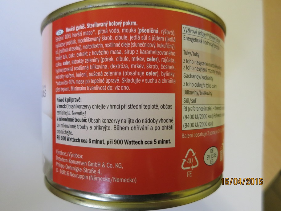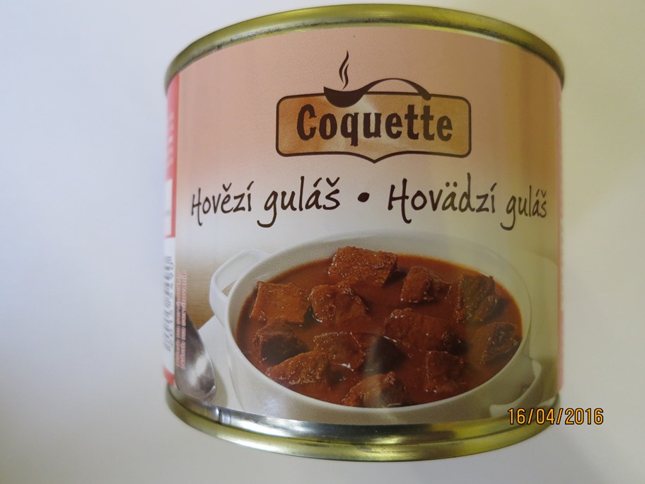 Coquette Hovězí guláš v balení 500 g, s označením data minimální trvanlivosti do 9. 7. 2018, šarže: L 517090, výrobce: Dreistern-Konserven GmbH & Co, KG, Philipp-Oehmigke-Straße 4, D- 16816 Neuruppin, Německo, zemně původu: Německo. Výrobce na obalu mj. uvedl: „Složení: 80% hovězí maso, …“, laboratorní rozbor tzv. dusíkovou metodou ale prokázal přítomnost masa v hodnotě 52,3%. Nepravdivým údajem o obsahu masa došlo ke klamání spotřebitele a SZPI nařídila neprodlené stažení výrobku z tržní sítě. Nevyhovující vzorek inspekce odebrala v provozovně společnosti Lidl Česká republika v.o.s.