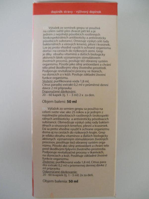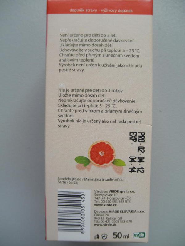 Státní zemědělská a potravinářská inspekce nařídila společnosti Virde s. r. o. stáhnout z obchodní sítě doplněk stravy Virde Citrus PARADISI grepový extrakt. Dvě šarže extraktu z grepových semen v balení 50 ml, označené daty použitelnosti 04/2014 a 02/2014 nevyhověly požadavkům uvedeným v nařízení EU 396/2005 o limitních množstvích reziduí pesticidů v potravinách. Tato norma připouští přítomnost látky Benzalkonium chlorid v potravinách v koncentraci maximálně 0,01mg/l. Laboratorní analýzou ale byla v uvedených šaržích výrobku prokázána přítomnost látky v množství o mnoho řádů vyšším – 4690mg/l a 5330mg/l. V souladu s nařízením 178/2002 byla proto potravina vyhodnocena jako škodlivá pro zdraví.