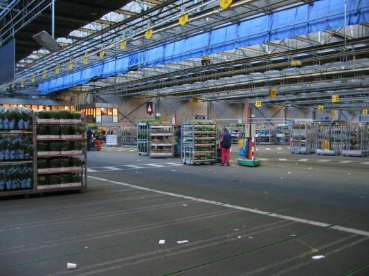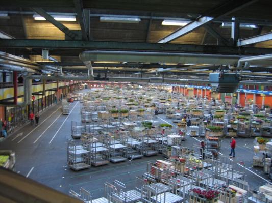 Foto 7.-9.(archív-Ing.A.Kosková, SZPI): Holandské květinové brzy se odehrávají na obrovských plochách. Aukce v Aalsmeeru má rozlohu srovnatelnou se stovkou fotbalových hřišť.