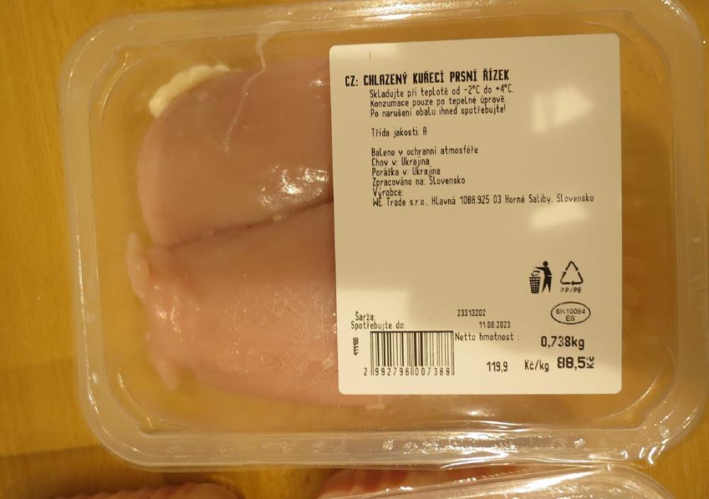 Státní zemědělská a potravinářská inspekce (SZPI) varuje spotřebitele před nebezpečnou potravinou, CHLAZENÝ KUŘECÍ PRSNÍ ŘÍZEK, šarže: 23313202, chov a porážka: Ukrajina, veterinární identifikační označení: SK10094 ES, zpracováno na: Slovensko, Výrobce: WE Trade s.r.o., Hlavná 1088, 925 03 Horné Saliby, Slovensko.
