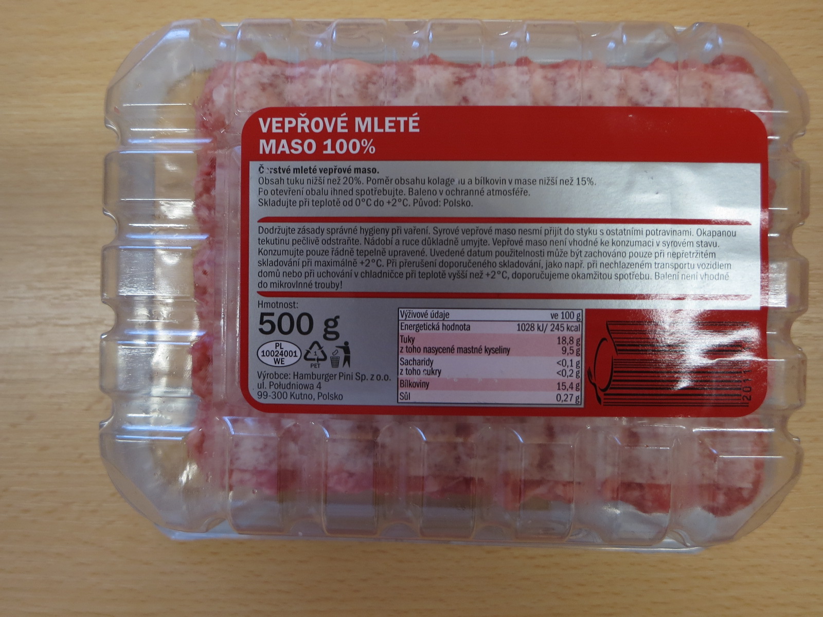 Laboratorním rozborem Státní zemědělská a potravinářská inspekce (SZPI) zjistila kontaminaci bakteriemi rodu Salmonella u potraviny Čerstvá porce - Vepřové mleté maso 100% v balení 500g a s označením šarže: 154511316005, výrobce: Hamburger Pini Sp. z o.o. ul. Poludniowa 4, 99-300 Kutno, Polsko, země původu: Polsko.