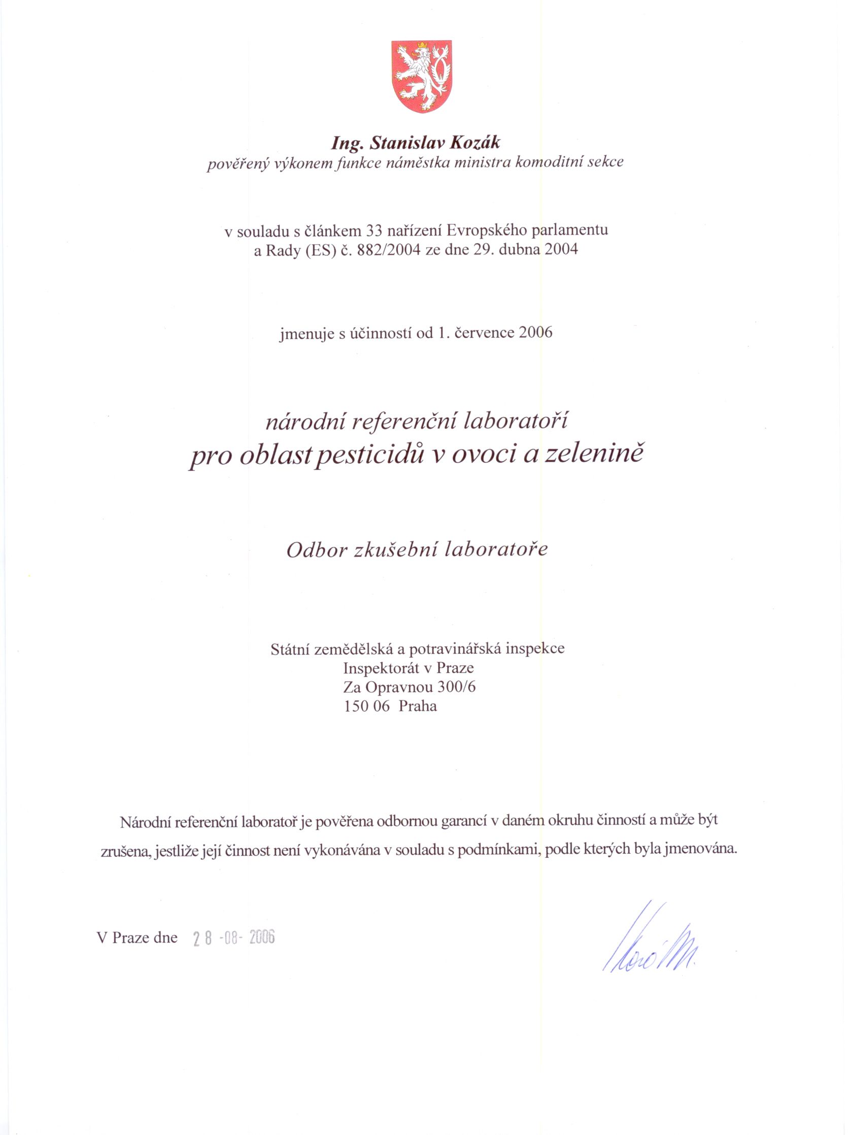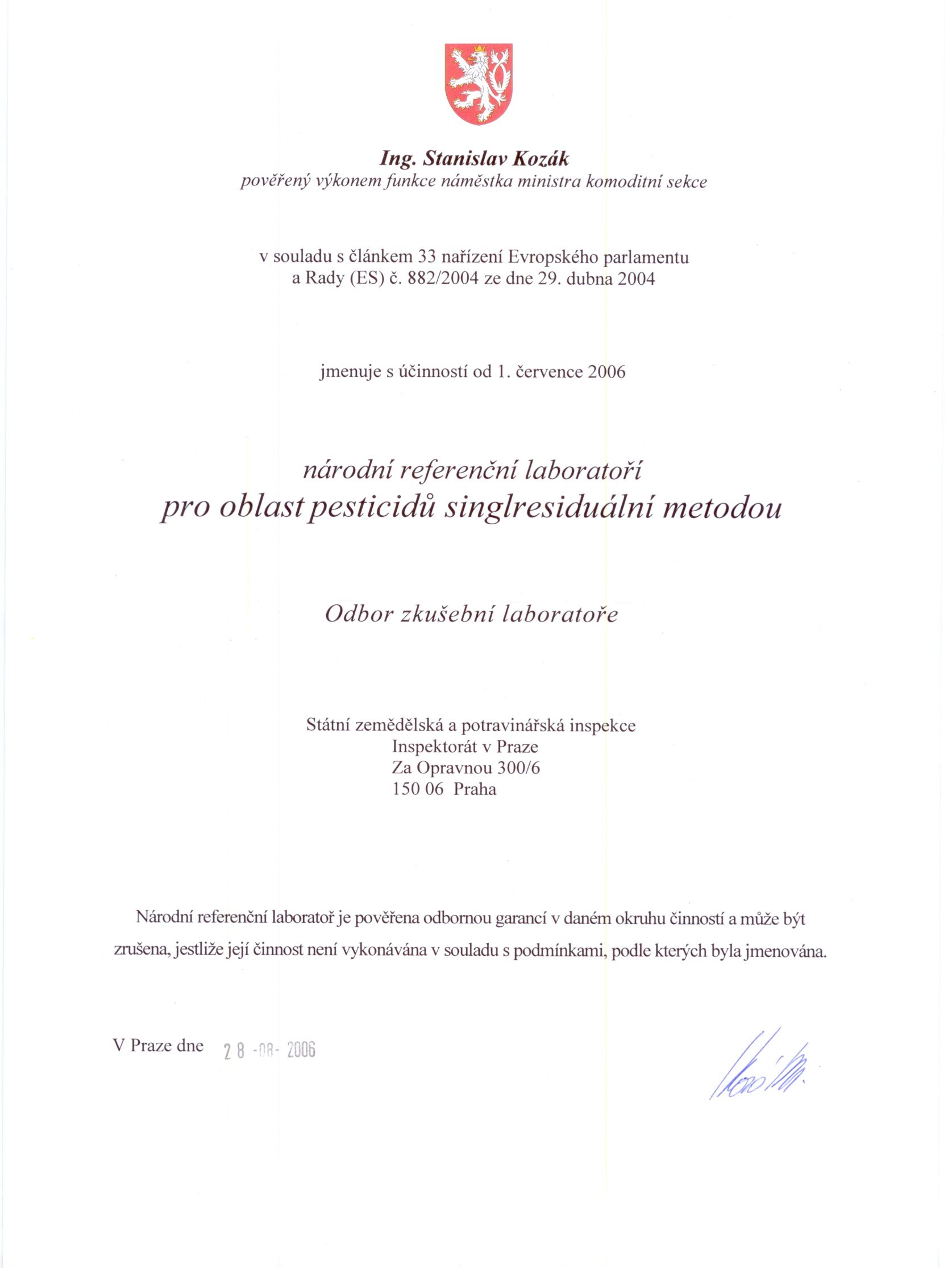 Laboratoř SZPI v Praze byla již v roce 2006 jmenována Národní referenční laboratoří (NRL, viz jmenování níže) pro oblast pesticidů a mykotoxinů a figuruje aktuálně jako NRL pro oblast pesticidů singlresiduální metodou, pesticidů v cereáliích a pesticidů v ovoci a zelenině, NRL pro mykotoxiny a rostlinné toxiny a NRL pro kontaminující látky z výroby. Základem bylo pořízení kapalinového chromatografu s hmotnostním detektorem (LC/MS/MS) a v návaznosti na to bylo systematicky rozšiřováno spektrum sledovaných reziduí pesticidů a kontaminantů. Laboratoř také provádí analýzy související s výživovým označováním potravin. V návaznosti na pořízení dvoudimenzionálního plynového chromatografu s hmotnostním detektorem na principu doby letu (GCxGC–TOF) a dalších kapalinových chromatografů s hmotnostním detektorem (LC/MS/MS) se laboratoř zaměřuje také na analýzu anabolických steroidů a hormonů v doplňcích stravy a sledování dalších zakázaných, biologicky aktivních látek a léčiv v potravinách.
