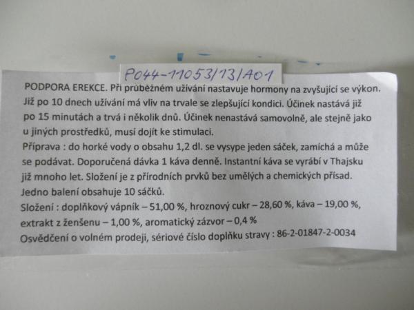 Státní zemědělská a potravinářská inspekce (SZPI) zakázala uvádět do oběhu výrobek INSTANT COFFEE MIXED v balení 160 g od výrobce COFFEE FARMER Co., Ltd., země původu: Thajsko. Laboratorní analýza u předmětního výrobku prokázala přítomnost účinné látky siledenafil v množství 39,4 mg na 1 dávku (sáček) a laktózy v koncentraci 886 mg na kilogram. Sildenafil je látka, jejíž použití není příslušnou legislativou v potravinářství povoleno a využívá se zejména v léčivech na podporu mužské erekce. Nevědomé požití této látky může způsobit závažné zdravotní komplikace kardiakům a lidem s vysokým krevním tlakem. Na obalu dále chyběla informace o přítomnosti laktózy, což je silný alergen a distributor je povinen na výrobku vyznačit jeho přítomnost. Z uvedených důvodů nelze potravinu považovat za bezpečnou, tím nevyhověla nařízení (ES) 178/2002 a SZPI proto neprodleně nařídila její stažení z tržní sítě.