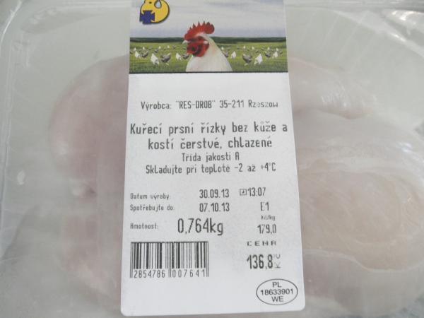 Kuřecí prsní řízky bez kůže a kostí čerstvé, chlazené, hmotnost 0,76 kg, datum výroby: 30. 09. 2013, výrobce: RES-DROB 35-211 Rzeszow. Země původu dle průvodní dokumentace: Polsko. Výrobek byl odebrán v provozovně společnosti Globus ČR, k.s., Chlumecká 765/6, Praha.