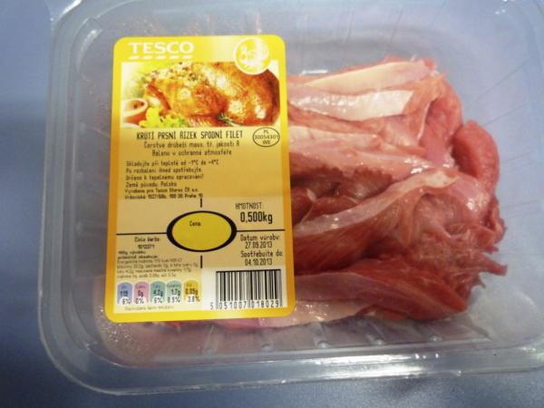 TESCO Krůtí prsní řízek, spodní filet v balení 0,500 kg, šarže: 1013371, vyrobeno pro: Tesco Stores ČR a.s., země původu: Polsko. Výrobce dle průvodní dokumentace: INDROL sp. Z o. o., Rostarzewo, Polsko. Výrobek byl odebrán v provozovně společnosti Tesco Stores ČR, a.s., Kafkova 8, Olomouc.