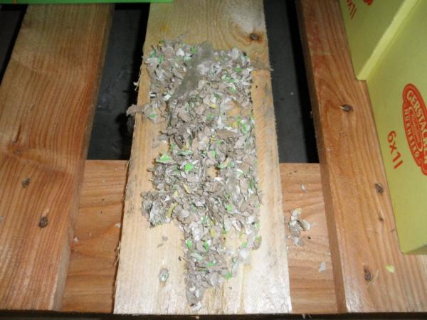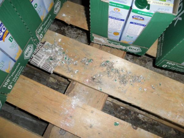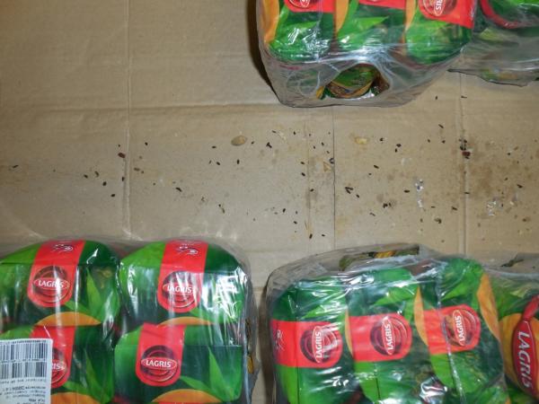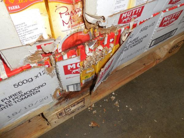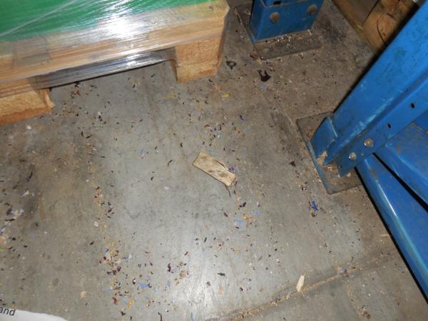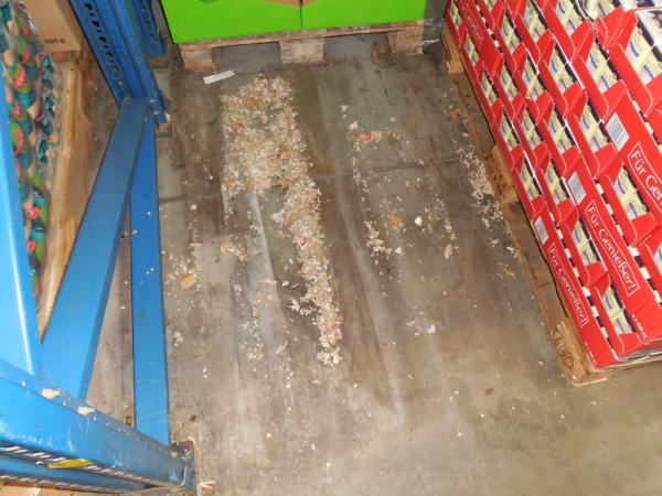 Při kontrole dne 18. 9. byla v části skladového komplexu zjištěna přítomnost myších exkrementů na podlahách pod paletami i mezi nimi, včetně nečistot v dolních částech regálového systému. V některých místech skladu byl zjištěn výskyt živých myší a byly objeveny stopy po jejich působení - rozkousané kartony a rozkousané obaly s potravinami. V průběhu prováděné kontroly byly potraviny s poškozenými obaly vyřazeny z uvádění na trh a byly připraveny k likvidaci.