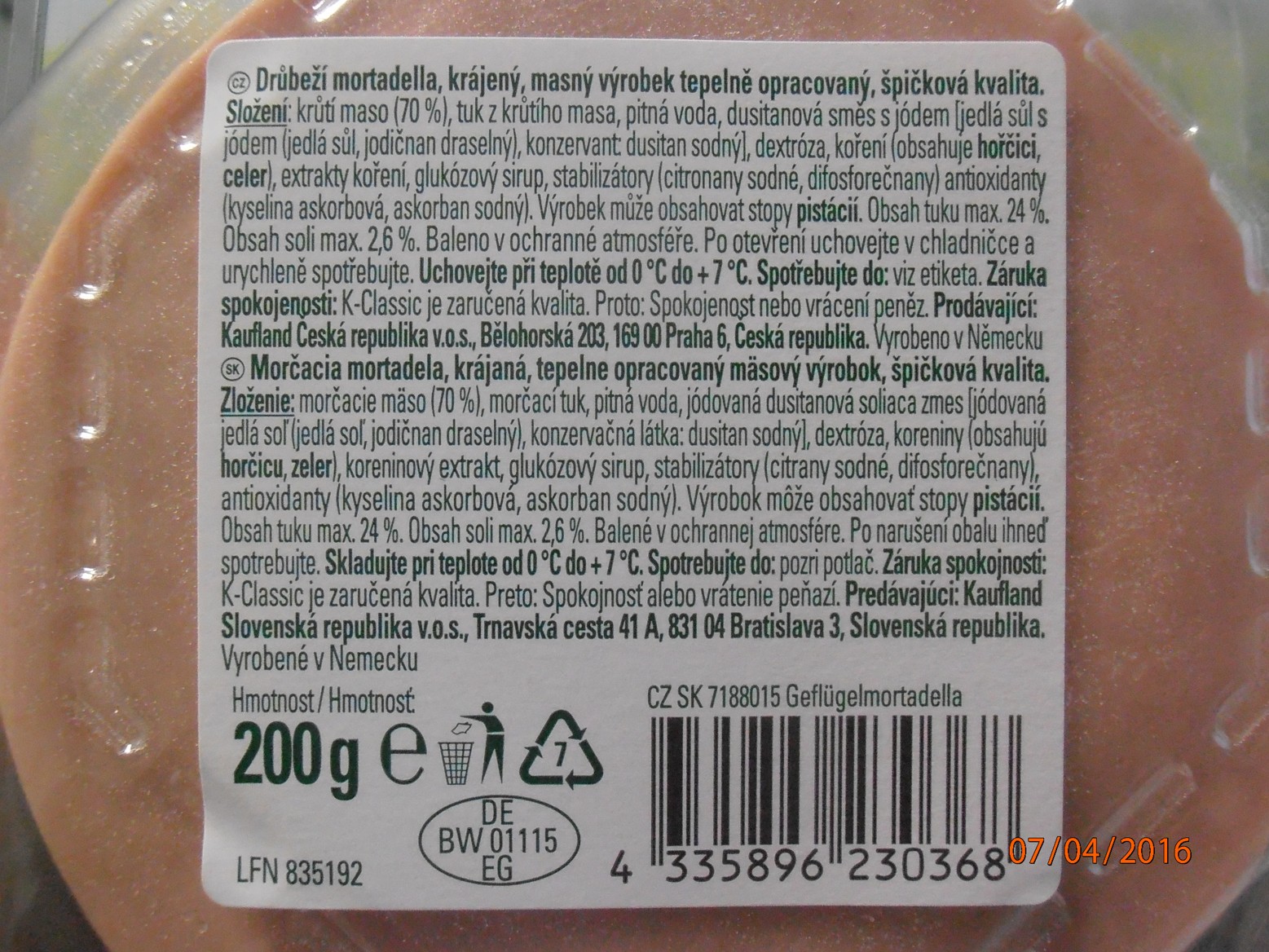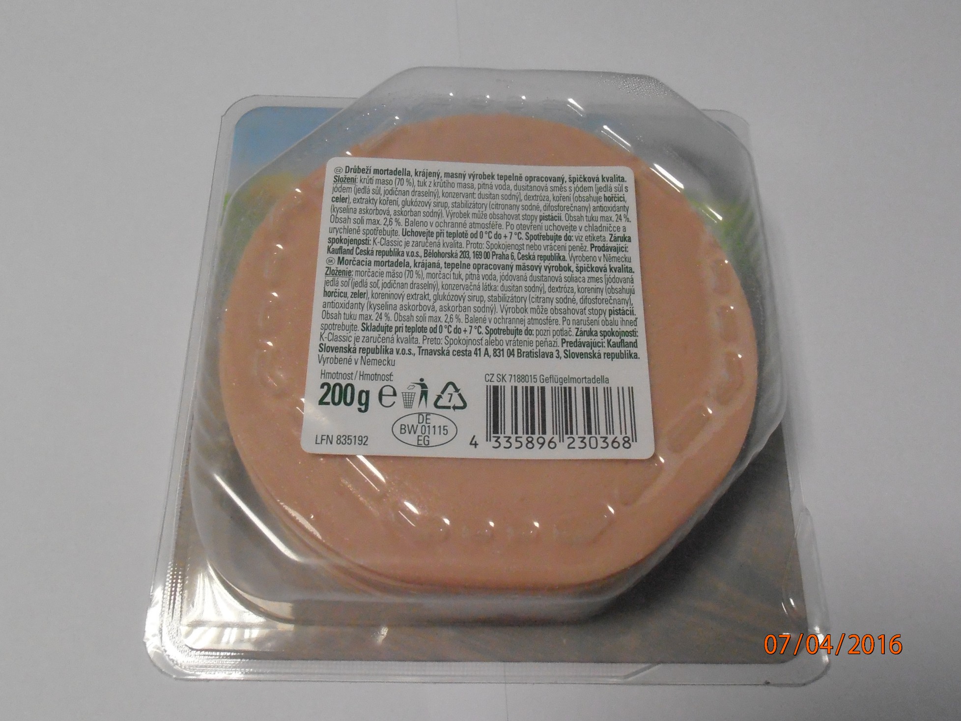 Inspektoři Státní zemědělské a potravinářská inspekce (SZPI) odebrali v rámci běžných kontrol v provozovně společnosti Kaufland Česká republika v.o.s. potravinu Drůbeží mortadella, masný výrobek tepelně opracovaný, označení šarže 075083, Prodávající: Kaufland Česká republika v.o.s, země původu: Německo. Na obalu potraviny bylo ve složení mj. uvedeno, že obsah masa představuje 70% hmotnosti výrobku. Při širokospektrální analýze však vyšlo najevo, že obsah masa je ve výši 57%.