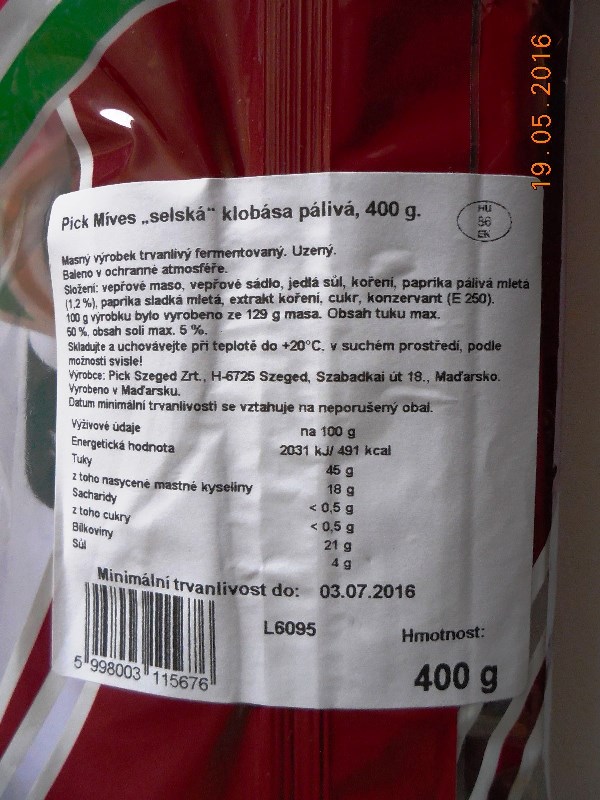 Pick Mives "selská" klobása pálivá, s označením data minimální trvanlivosti do 03. 07. 2016., šarže L6095, výrobce: Pick Szeged Zrt.,H-6725 Szeged, Szabadkai út.18, Maďarsko. Laboratorní analýzou byl prokázán obsah masa 114,1% oproti deklarovaným 129%. Potravina byla uváděna na trh v distribuci společnosti Kaufland Česká republika v.o.s.