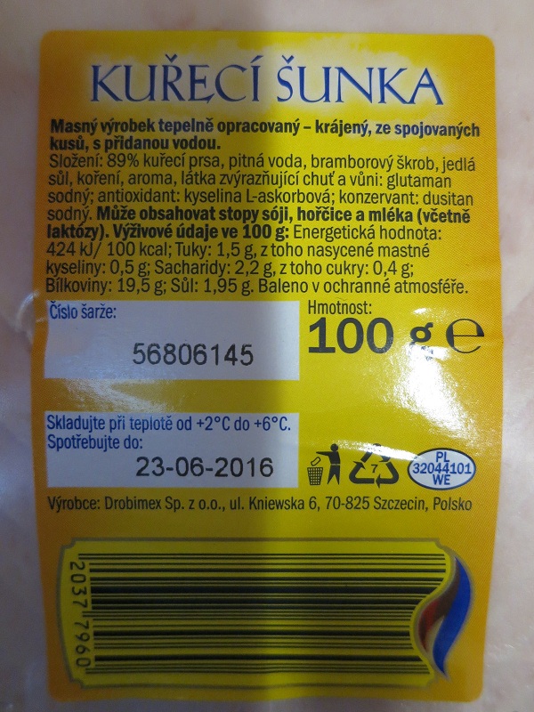 Kuřecí šunka, s datem použitelnosti 23 06 2016, šarže 56806145, výrobce: Drobimex Sp.z o.o., ul. Kniewska 6, 70-825 Szczecin, Polsko. Výrobce se dopustil klamání spotřebitele prostřednictvím informace na obalu, kde uváděl 89% obsahu masa, avšak laboratorní analýza stanovila pouhých 79,2%. Potravina byla odebrána v obchodním řetězci společnosti Lidl Česká republika v.o.s.