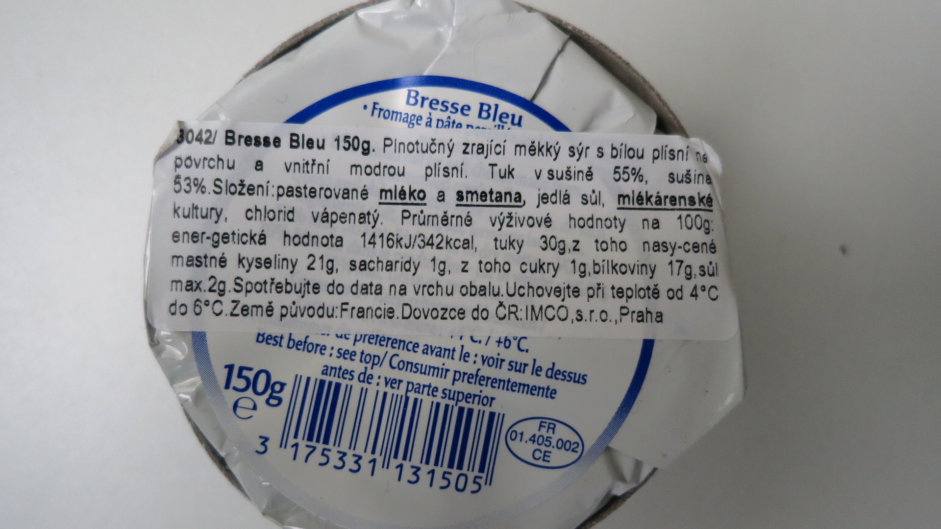 Bresse Bleu, v balení 150g s datem použitelnosti 24. 04. 16, šarže 24 04 16 041, dovozce IMCO, s.r.o., Praha, země původu Francie. Výsledky z laboratoře u sýru prokázaly obsah sušiny v hodnotě 47,80% oproti deklaraci na obalu, která uváděla 53%. Rozbor tak prokázal klamání spotřebitele nepravdivým tvrzením na etiketě. Sýr byl v prodeji v obchodním řetězci společnosti Globus ČR, k.s.