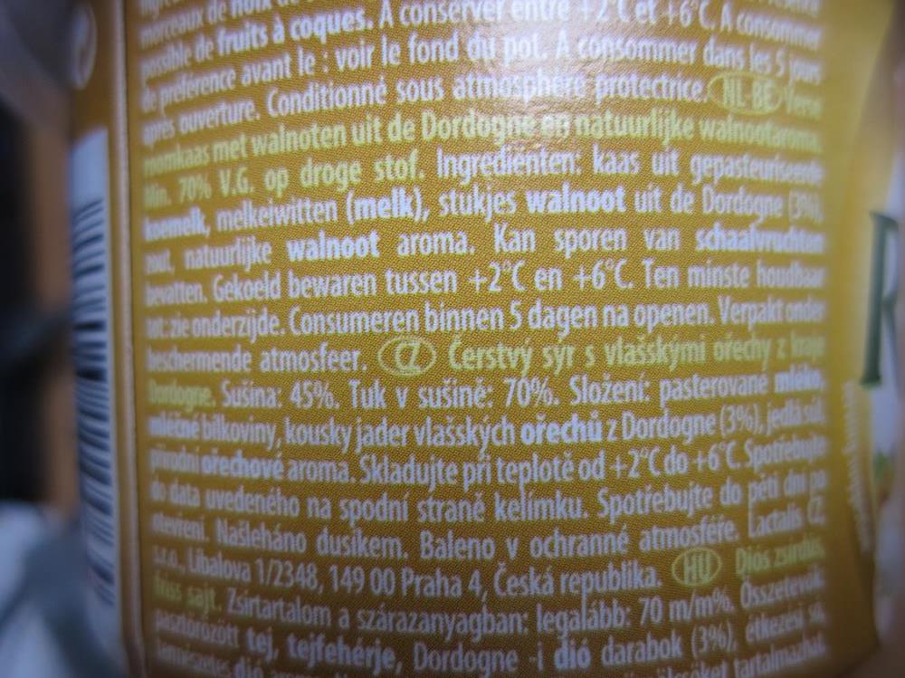PRÉSIDENT Rondelé Noix de Dordogné - Čerstvý sýr s vlašskými ořechy z kraje Dordogne - s označením data použitelnosti do 26/07/16, distributor: Lactalis CZ, s.r.o., země původu: Francie. Výrobce uvedl podíl sušiny 45%, ale laboratorní analýza potvrdila pouze 42,6%. Výrobek se nacházel v distribuci společnosti Penny Market s.r.o.